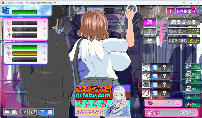 在电车内对辣妹进行性骚扰行为可以积累点数,从而解锁更升级的行为。当快感值达到最大时,辣妹会达到高潮,你便能获得她的心。